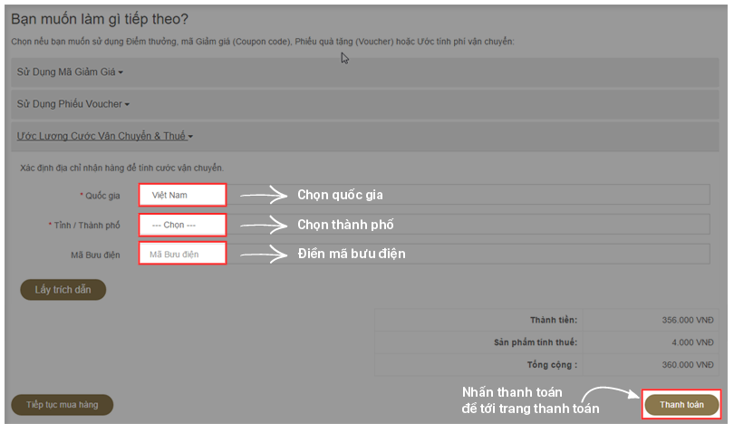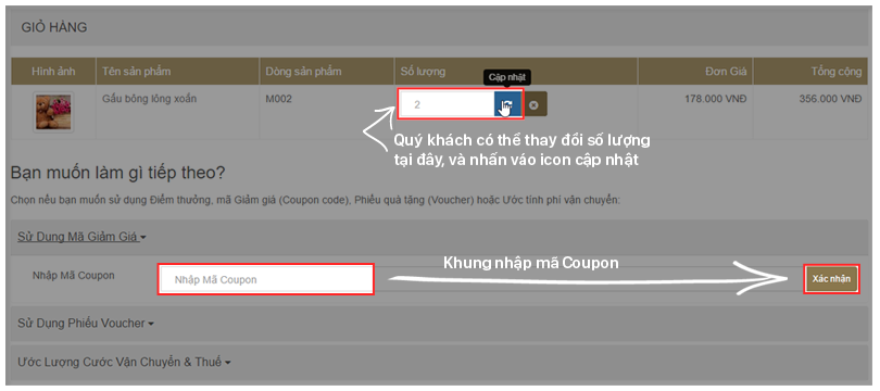 → Bước 6: Tại trang giỏ hàng , quý khách có thể điều chỉnh số lượng sản phẩm, thêm mã coupon, voucher nếu có cũng như phí vận chuyển ,…